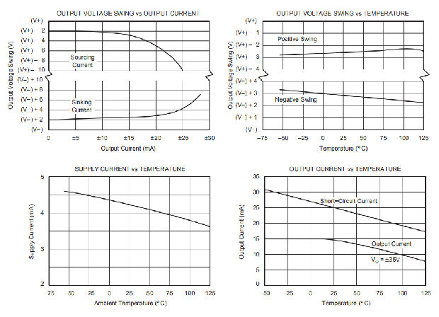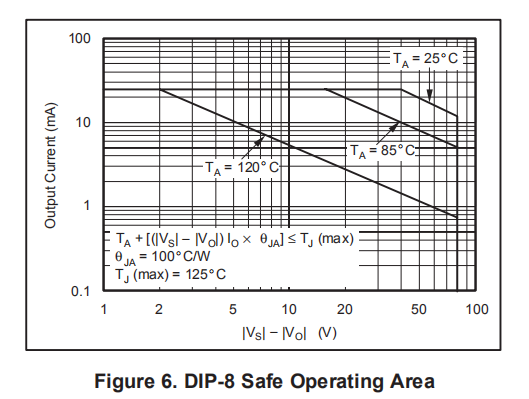 随着VS−VO的增加,安全输出电流减小。输出短路对SOA来说是一个非常苛刻的情况。对地短路迫使整个电源电压(V+或V-)穿过导电晶体管,并产生25毫安的典型输出电流。对于±40V电源,这将产生1W的内部损耗。