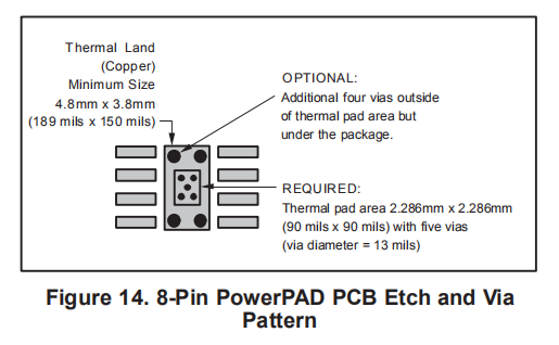 3、在隔热垫区域放置推荐的孔。图14显示了SO-8 DDA组件的热焊盘尺寸和热通孔模式。这些孔的直径应为13密耳。保持它们很小,这样焊料芯吸通过孔在回流焊期间不是问题。SO-8 PowerPAD封装的最小建议孔数为5个。