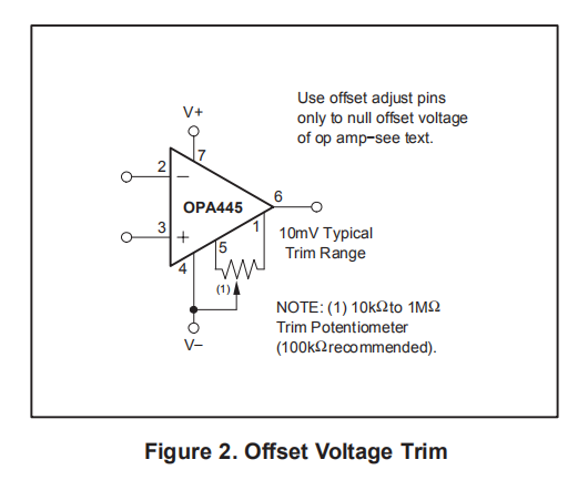 OPA445在针脚1和5上提供偏置电压微调连接。如图2所示,可以通过连接电位计来调整偏移电压。此调整仅用于使运算放大器的偏移为零,而不是调整系统偏移或信号源产生的偏移。零位系统偏移会降低运算放大器的偏移电压漂移行为。虽然无法预测漂移的确切变化,但影响通常很小。