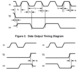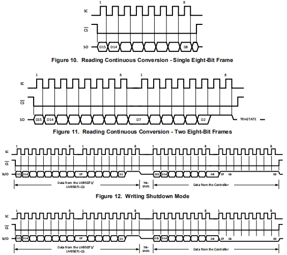 LM95071/LM95071-Q1作为从机运行,并与SPI或微线总线规范兼容。数据在串行时钟(SC)的下降沿上时钟,而数据在串行时钟的上升沿上时钟。一个完整的通信是由下降和上升的芯片选择(CS)信号构成的。应保持CS信号通信之间至少有一个时钟周期(最小160纳秒)为高。仅传输的通信(寄存器读取)由16个时钟周期组成。完整的发送/接收通信将由32个串行时钟(见串行总线时序图)。前16个时钟包括通信,而第二个16个时钟是接收相位。当CS较高时,SI/O处于三态。通信应通过降低芯片选择(CS)启动。当SC从低状态变为高状态时,不应这样做。一旦CS低,串行I/O引脚(SI/O)将传输第一位数据。然后,主机可以用SC的上升沿读取该位数据将由SC的下降沿定时。在传输过程中,CS可以在任何时候取高阶段。如果转换过程中CS变低,LM95071/LM95071-Q1将完成转换输出移位寄存器将在CS恢复高电平后更新。通信的接收阶段在16个SC周期之后开始。CS可在32个SC周期内保持低水平。这个LM95071/LM95071-Q1将读取串行时钟上升沿上SI/O线上的可用数据。输入数据传输到8位移位寄存器。该部件将检测最后八位移入寄存器。接收阶段最多可维持16个SC周期。所有这些都必须移动,以便将部件置于停机状态。所有零必须是移动以将LM95071/LM95071-Q1置于连续转换模式。只有以下代码应发送至LM95071/LM95071-Q1: