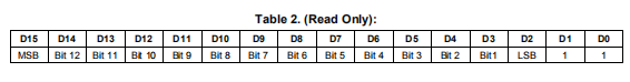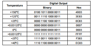 温度数据由一个14位表示,两个补码的LSB(最低有效位)等于0.03125摄氏度: