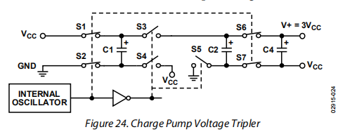 在振荡器高相期间,S10和S11打开,而S8和S9关闭。在几个周期内,C3从电压三倍频器的输出端充电到3VCC。在振荡器低相期间,S8和S9打开,而S10和S11关闭。C3跨C5连接,其正极端子接地,负极端子为V输出。在几个循环中,C5充电至−3 VCC。