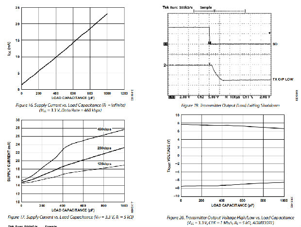 驱动器将3.3V逻辑输入电平转换为EIA-232输出电平。当Vcc=3.0 V并驱动EIA-232负载时,输出电压摆幅通常为±6.4 V(或ADM3310E和ADM3315E为±5.5 V)。