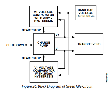 关机模式通过完全关闭电荷泵来最小化功耗。在这种模式下,电压三倍器中的开关配置为V+直接连接到VCC。V−为零,因为没有充油泵操作来充注C5。这意味着在V+和V-达到其正常工作电压之前,退出停机模式时会有一个延迟。绿色空闲在变送器空闲状态下保持变送器电源电压,因此不会发生这种延迟。