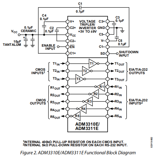 接收器是反转电平移位器,接受RS-232输入电平并将其转换为3.3v逻辑输出电平。输入端有5 kΩ的内部下拉电阻器(ADM3310E为22 kΩ)接地,并可防止高达±30 V的过电压。未连接的输入端由内部5 kΩ(或ADM3315E为22 kΩ)下拉电阻器拉至0 V。因此,对于未连接的输入或连接到GND的输入,这将导致逻辑1输出电平。