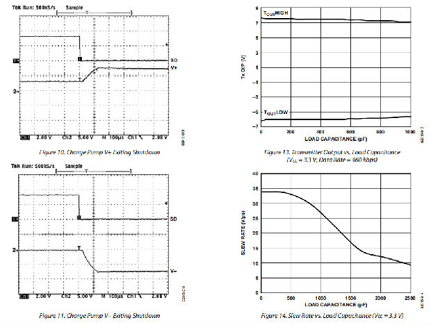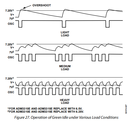 但是,需要注意的是,与其他电荷泵dcto dc转换器不同,ADM3307E上的电荷泵不开环运行。输出电压通过绿色空闲电路调节至±7.25 V(对于ADM3310E和ADM3315E为±6.5 V),实际上从未达到±9 V。这样既节省了电力,又保持了更恒定的输出电压。