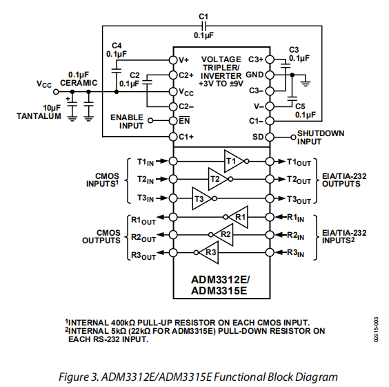 ADM3312E和ADM3315ADM331E-ic/" title="ADM3315ADM3315ADM331E">ADM3315ADM3315ADM331E适用于恶劣环境下的ADM3315ADM331E。ADM3307E包含ESD所有I/O线路(CMOS、RS-232、EN和SD)的保护高达±15 kV。