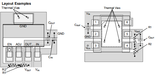 必须使用良好的PC布局实践,否则会因接地回路和电压降而导致不稳定。输入和输出电容器必须使用直接连接到调节器的输入、输出和接地引脚没有其他电流流过的记录道(开尔文连接)。最好的方法是将CIN和COUT布置在设备附近,并对输入、输出和GND进行短距离跟踪别针。调节器接地针脚必须连接到外部电路接地,以便调节器及其电容器有单点接地。稳定性问题已经出现在使用内部接地层通孔的应用中装置的接地点以及输入和输出电容器。这是由于这些节点是由流过地平面的电流引起的。使用单点接地技术调节器和调节器电容器解决了这个问题。因为高电流流过输入和输出,开尔文将电容器引线连接到这些引脚上,这样就不会有电压降串联输入和输出电容器。