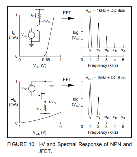 许多音频专家认为高性能FET运算放大器的音质优于双极运算放大器。其中一个可能的原因是双极性设计比fet产生更大的奇次谐波。对于人类的耳朵来说,奇数次谐波一直被认为比偶数次谐波听起来更令人不快。fet和真空管一样,具有平方律的I-V传递函数,比双极晶体管的指数传递函数更线性。作为平方律特性的直接结果,fet主要产生偶数次谐波。图10显示了双极晶体管和场效应晶体管的传递函数。两个传递函数的傅里叶变换揭示了场效应晶体管放大器级的低奇次谐波。