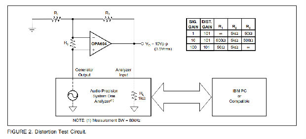 OPA604产生的失真低于几乎所有商用设备的测量限值。然而,一个特殊的测试电路可以用来扩展测量能力。
