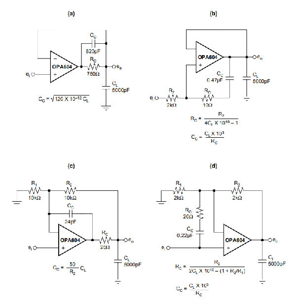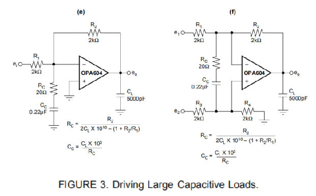 OPA604的动态特性已针对常见增益、负载和工作条件进行了优化。低闭环增益和电容性负载的结合会降低相位裕度,并可能导致增益峰值或振荡。负载电容与运算放大器的开环输出电阻反应,在反馈回路中形成一个额外的极点。图3显示了在电容性负载下保持相位裕度的各种电路。