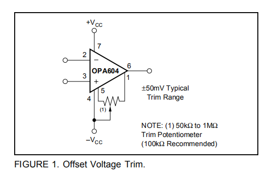 OPA604偏置电压是激光微调的,在大多数应用中不需要进一步微调。与大多数放大器一样,对于每100μV的调整偏移,外部微调剩余偏移可使漂移性能改变约0.3μV/°C。OPA604可以通过不连接外部零位电路来取代许多其他放大器。