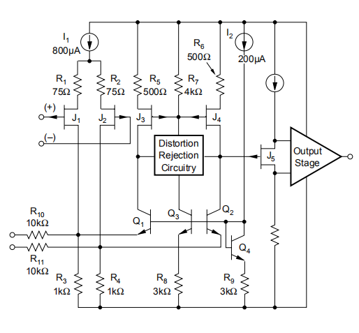 J1和J2的漏极由Q1和Q2级联,驱动输入级负载fetj3和J4。失真抑制电路(专利)线性化开环响应和增加电压增益。OPA604的20MHz带宽通过用户连接的反馈回路进一步减少失真。