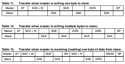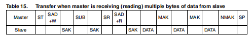 在多个字节的地址中断言最有意义的字节是必需的。换句话说,SUB(7)必须等于1,而SUB(6-0)表示要读取的第一个寄存器的地址。在所提出的通信格式中,MAK是主确认,NMAK是no主确认。