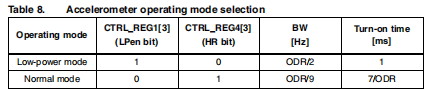 LSM303DLHC提供两种不同的加速运行模式,分别报告“正常模式”和“低功耗模式”。正常模式保证高分辨率,低功耗模式进一步降低了电流消耗。表8总结了如何选择操作模式。