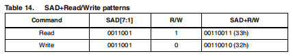 对于线性加速,默认(出厂)7位从机地址为0011001b。从机地址由一个读/写位完成。如果位为“1”(读取),则重复启动(SR)条件必须在两个子地址字节之后发出;如果位为“0”(写入)主站向从站发送,方向不变。表14解释了组成了读/写位模式,列出了所有可能的配置。