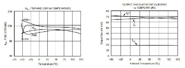 典型性能曲线显示了推荐的RS与电容性负载以及负载下产生的频率响应。设置推荐电阻器的标准是负载处的最大带宽、平坦频率响应。由于现在在输出管脚和负载电容之间有一个无源低通滤波器,输出管脚本身的响应通常有点峰值,并且在RC网络的滚降作用后变得平坦。在大多数应用程序中,这不是一个问题,但是如果负载下的期望信号摆幅非常接近放大器的摆幅极限。这种限幅最有可能发生在脉冲响应应用中,其中频率峰值表现为阶跃响应中的过冲。