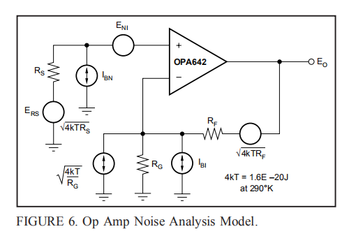 OPA642以低输入噪声项补充其超低谐波失真。输入参考电压噪声和两个输入参考电流噪声项结合在一起,可在各种工作条件下产生较低的输出噪声。图6显示了包含所有噪声项的运算放大器噪声分析模型。在这个模型中,所有的噪声项都被认为是以nV/√Hz或pA/√Hz表示的噪声电压或电流密度项。