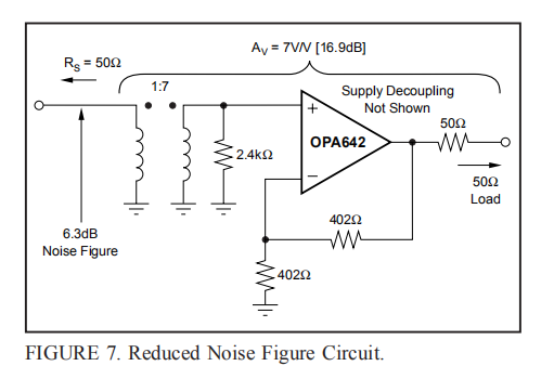 对图1电路的方程式3进行计算,得出噪声系数=17.6dB。输入变压器耦合可用于降低该噪声系数。宽带脉冲变压器可以提供一个无噪声的电压增益和一个更优化的源阻抗,以最小化噪声系数。图7显示了根据图1的电路构建的示例,其中变压器匝数比已设置为最小噪声系数的最接近整数。最佳匝数比的计算公式如下: