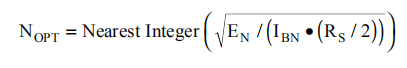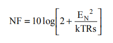 窄带通信系统通常关心放大器的噪声系数。总输入参考电压噪声表达式(公式2)可用于计算噪声系数。方程3显示了这个噪声系数表达式,使用式2的EN表示非反相配置,其中输入端接电阻器RT已设置为与源阻抗匹配(如图1所示)。