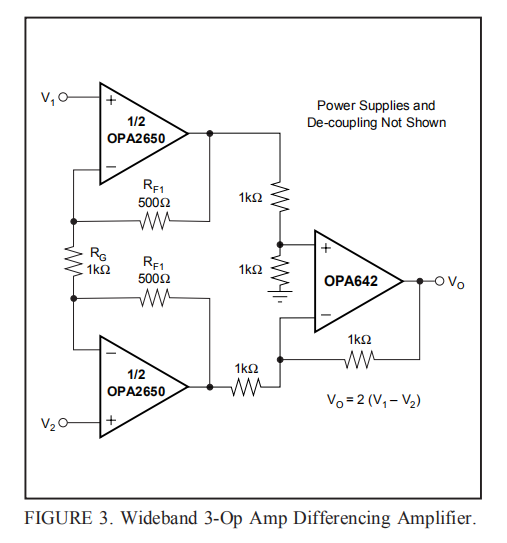 单运放差分放大器的主要缺点是输入阻抗相对较低。当差分输入端需要高阻抗时,可以使用OPA642作为差分级来构建标准仪表放大器(INA)拓扑。图3显示了一个例子,其中两个输入放大器封装在一起作为一个双电压反馈运算放大器OPA2650。与使用两个额外的OPA642器件相比,这种方法节省了电路板空间、成本和功耗,并且由于输入放大器的中等负载,仍然可以获得非常好的噪声和失真性能。在该电路中,由于四个匹配的1kΩ电阻器,输出的共模增益始终为1,而差分增益由(1+2RF1/RG)设置,使用图3中的值等于2。差分到单端的转换仍然由OPA642输出级执行。高阻抗输入允许V1和V2源端接或阻抗匹配,无需差分放大器进一步加载。如果V1和V2输入已经是真正的差分输入,例如信号变压器的输出,则可以在它们之间使用一个匹配的终端电阻。但是,请记住,对于V1和V2输入,必须始终存在定义的直流信号路径;对于变压器情况,中心抽头次级连接到地面将提供最佳的直流操作点。