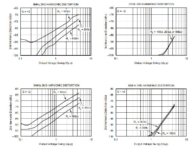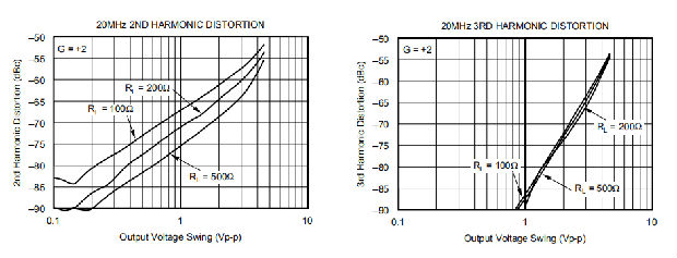 一般来说,在基波信号达到很高的频率或功率之前,二次谐波将主导失真,而三次谐波分量可以忽略不计。然后聚焦于二次谐波,增加负载阻抗直接改善失真。请记住,在非反相配置中,总负载包括反馈网络这是RF+RG的总和,而在反向配置中,这只是RF(图1)。增大输出电压摆幅直接增加谐波失真。输出摆幅增加6dB通常会增加二次谐波12dB和三次谐波18dB。增加信号增益也会增加二次谐波失真。同样,增加6分贝的增益将增加第二和第三谐波6分贝,即使在恒定的输出功率和频率。最后,由于环路增益随频率的衰减,失真随着基频的增加而增加。相反地,失真将改善到低频,直至大约3kHz的主开环极点。从2Vp-p的–90dBc二次谐波到500Ω,G=+2 1MHz下的失真(根据典型性能曲线),20kHz下的二次谐波失真应大约为–90dB–20log(1MHz/20kHz)=–124dBc。