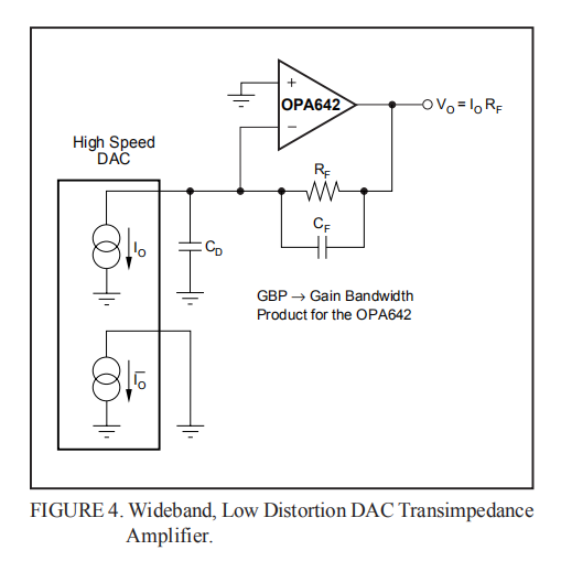 高频DDC-dac需要一个低失真的输出放大器,以保持其SFDR性能进入真实的负载。单端输出驱动实现如图4所示。在该电路中,只使用互补输出驱动信号的一侧。该图显示了连接到OPA642的虚拟接地和结的信号输出电流,OPA642被设置为跨阻级或“I-V转换器”。DAC未使用的电流输出接地。如果DAC要求其输出端接至非接地的合规电压进行操作,则适当的电压电平可应用于OPA642的非逆变输入端。这个电路的直流增益等于射频。在高频下,DAC输出电容将在OPA642的噪声增益中产生零,这可能导致闭环频率响应的峰值。在射频中加入CF以补偿噪声增益峰值。为了实现平坦的跨阻频率响应,反馈网络中的该极点应设置为: