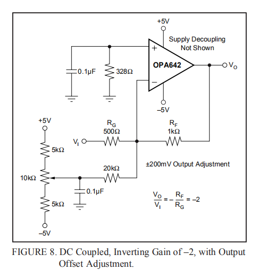 有时需要微调输出偏移零点或直流工作点调整。在运算放大器电路中引入直流偏移控制有许多技术。这些技术中的大多数最终都会减少到通过反馈电阻设置直流电流。选择一种技术的一个关键考虑因素是确保它对期望的信号路径频率响应的影响最小。如果信号路径打算是非反相的,则偏移控制最好作为反相求和信号应用。如果信号路径要反转,可以考虑对非反转输入应用偏移控制。对于直流耦合信号,在某些配置中,直流偏移信号可以设置直流电流回到必须考虑的源中。对反向运算放大器输入进行调整也可以改变噪声增益和频率响应平坦度。图8显示了对信号频率响应影响最小的直流耦合信号路径的偏移调整示例。在这种情况下,输入被引入到一个逆变增益电阻器,直流调节的附加电流加在逆变节点上。设置此电流的电阻网络比信号通路电阻大得多。这将确保这种调整对环路增益和频率响应的影响最小。