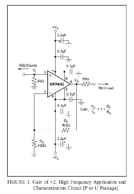 图1显示了作为大多数典型性能曲线基础的+2配置增益。大多数曲线的特征是使用50Ω驱动阻抗的信号源和50Ω并联负载阻抗的测量设备。在图1中,VI端子处的50Ω并联电阻器与测试发生器的源阻抗匹配,而VO端子上的50Ω串联电阻器为测量设备负载提供匹配电阻器。一般来说,数据表规格是指输出引脚处的电压摆动(图1中的VO)。串并联匹配电阻产生的100Ω负载,加上804Ω的总反馈网络负载,使OPA642具有大约90Ω的有效负载。
