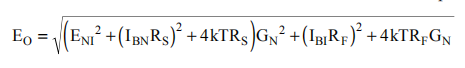 总的输出点噪声电压可以计算为输出噪声电压贡献项的平方根。这种计算方法是在输出端叠加所有的噪声功率,然后取平方根得到一个点噪声电压。方程式1显示了输出噪声电压的一般形式,使用图6所示的术语。