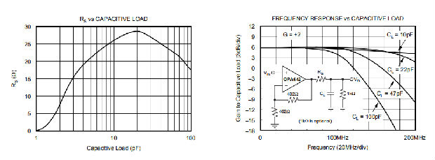 对运算放大器来说,最苛刻,也是最常见的负载条件之一是电容性负载。像OPA642这样的高速、高开环增益放大器,当电容性负载直接施加在输出引脚上时,其稳定性和闭环响应峰值非常敏感。简单地说,电容性负载与放大器的开环输出电阻发生反应,在环路中引入额外的极点,从而减小相位裕度。这个问题已经成为应用程序注释和文章的热门话题,并且已经提出了一些解决这个问题的外部解决方案。当主要考虑频率响应平坦度、脉冲响应保真度和/或失真时,最简单和最有效的解决方案是通过在放大器输出和电容性负载之间插入一个串联的隔离电阻,将电容性负载与反馈回路隔离。这并没有从环路响应中消除极点,而是将其移位,并在更高频率下添加零。附加零位的作用是消除电容性负载极的相位滞后,从而增加相位裕度,提高稳定性。