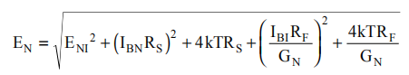 将该表达式除以噪声增益(GN=1+RF/RG)将得到非逆变输入下的等效输入参考点噪声电压,如等式2所示。