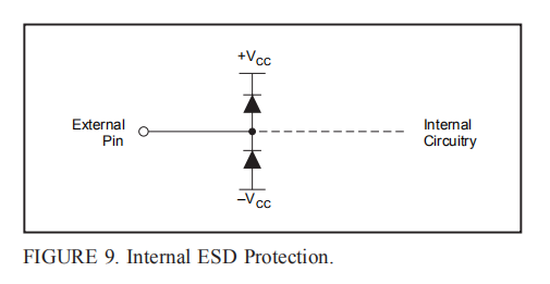 OPA642是建立在一个非常高速互补双极工艺。由于这些非常小的几何器件,内部结击穿电压相对较低。这些细分反映在绝对最大评级表中。如图9所示,所有设备引脚都由内部ESD保护二极管保护电源。