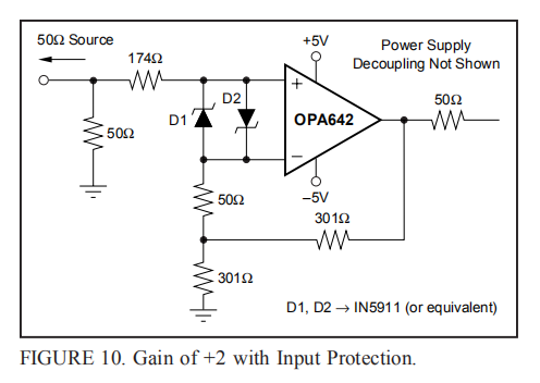 高输入过驱动信号也会在+和–输入之间造成显著的电压差。当该电压超过最大额定电压±1.2V时,应在两个输入端添加外部肖特基保护二极管。同样,由这些二极管增加的电容会降低噪声和交流性能,只应在必要时使用。图9显示了OPA642的全功能输入保护电路。这是图1的电路,输入端有附加的限制电阻,输入端有肖特基钳位二极管。选择这些电阻值是为了限制噪声和频率响应的退化,实现直流偏置电流抵消,并限制过驱动条件下的电流。