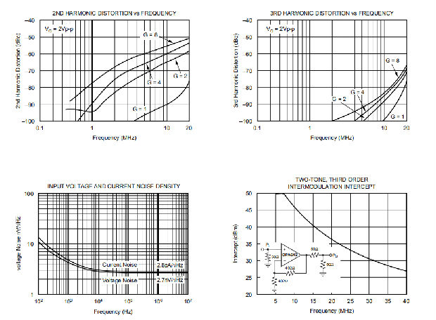 OPA642能够以高频率和低增益传输异常低的失真信号。典型性能曲线中的畸变图显示了各种情况下的典型畸变。大多数曲线图的动态范围限制为100dB。在信号电平超过0.5V和/或基频超过500kHz之前,OPA642的失真不会上升到–100dBc以上。音频带失真≤–120分贝。