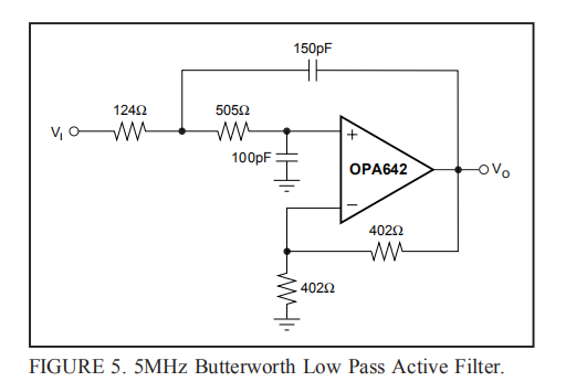 图5显示了一个示例Sallen-Key低通滤波器,其中OPA642被设置为提供+2的低频增益。选择滤波器组件值,以获得最大平坦的巴特沃斯响应,带宽为5MHz–3dB。电阻值已经过轻微调整,以补偿该配置中由OPA642提供的150MHz带宽的影响。该滤波器可与ADC驱动器建议相结合,以提供中等(2极)奈奎斯特滤波、限制噪声和带外分量到ADC的输入中。该滤波器将提供高SFDR A/D转换器(如ADS804(12位、10MSPS、80dB SFDR)所需的极低谐波失真。
