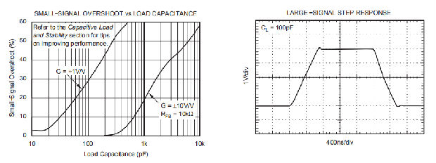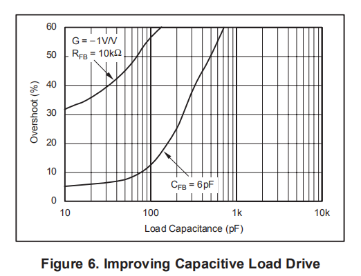 例如,当驱动单位增益逆变器配置中的100pF负载时,与10kΩ反馈电阻器并联的6pF电容器将过冲从57%降低到12%,如图6所示。