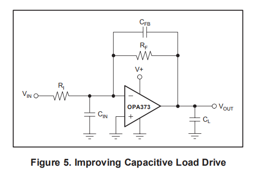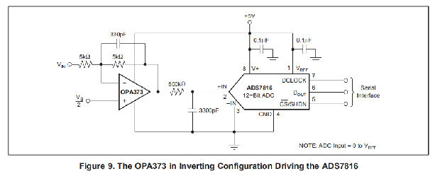 OPA373显示在图9中描述的反转配置中。在这种配置中,滤波可以通过反馈电阻上的电容来完成。
