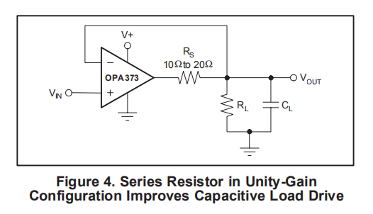 改进单位增益配置中电容性负载驱动的一种方法是在输出端串联一个小的(10Ω到20Ω)电阻器RS,如图4所示。这大大减少了振铃,同时保持了纯电容性负载的直流性能。当电阻负载与电容性负载并联时,RS必须置于反馈回路内,如图所示,以允许反馈回路补偿由RS和RL产生的分压器。
