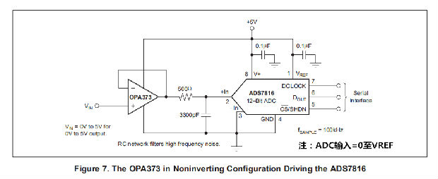 图7显示了OPA373在基本的非转换配置中驱动ADS7816,如图7所示。ADS7816是MSOP-8封装中的一个12位、微功耗采样转换器。当与OPA373的低功耗微型封装一起使用时,这种组合是空间有限、低功耗应用的理想选择。在这种配置中,ADC输入端的RC网络可用于提供抗混叠滤波。