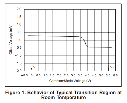 OPA373和OPA374系列的输入共模电压范围超出电源轨200mV。这是通过一个互补输入级一个N信道输入差分对与一个P信道差分对并行来实现的。N-通道对对于靠近正轨的输入电压有效,通常为正极电源上方(V+)-1.65V至200mV,而P-通道对对于从负极电源下方200mV至大约(V+−1.65V)的输入打开。存在一个500mV过渡区,通常为(V+)-1.9V至(V+)-1.4V,两对都开着。图1所示的500mV过渡区可随工艺变化而变化±300mV。因此,在低端,过渡区(两个阶段都开启)的范围为(V+)-2.2V至(V+)-1.7V,高端可达(V+)-1.6V至(V+)-1.1V。在500mV过渡区内,与在该区外运行相比,PSRR、CMRR、偏移电压、偏移漂移和THD可能降低。