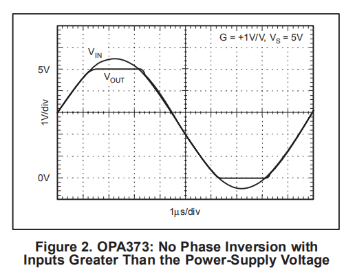 输入共模范围从(V−)−0.2V扩展到(V++0.2V)。对于正常操作,输入应限制在该范围内。绝对最大输入电压为500毫伏以上的电源。大于输入共模范围但小于最大输入电压的输入虽然无效,但不会对运算放大器造成任何损坏。与其他运算放大器不同,如果输入电流受限,则输入可能会超出电源而不发生相位反转,如图2所示。