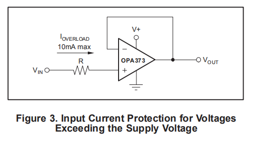 正常情况下,输入偏置电流约为500fA;但是,输入电压超过电源超过500mV会导致过多电流流入或流出输入引脚。如果输入引脚上的电流限制在10毫安,则可以容忍超过电源500毫伏的瞬时电压。这很容易用一个输入电阻来实现;见图3。(许多输入信号固有的电流限制在10mA以下,因此不需要限制电阻器。)
