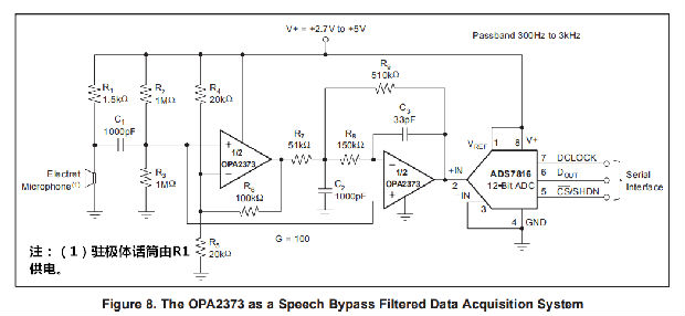 图8显示了在语音带通滤波数据采集系统中驱动ADS7816的OPA373。这种小型、低成本的解决方案提供了必要的放大和信号调节,以便直接与驻极体麦克风接口。该电路将在VS=2.7 V至5 V的情况下工作。