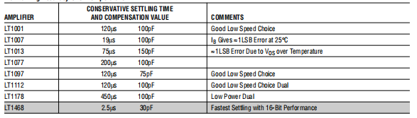 表2。LT1595 DAC驱动的各种放大器的16位稳定时间。LT1468(阴影)提供最快的沉降时间保持超温精度