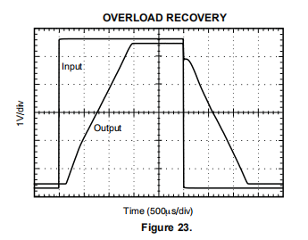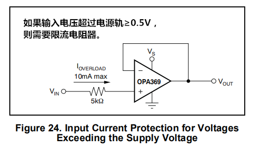 输入电流通常为10pA。但是,大输入(电源轨外大于500mV)会导致过多电流流入或流出输入引脚。因此,除了保持电源轨之间的输入电压外,将输入电流限制在10mA以下也很重要。这个限制很容易用一个输入电阻来实现,如图24所示。
