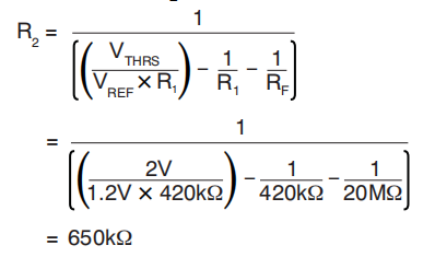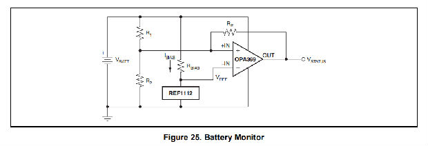 OPA369系列的低工作电压和静态电流使其成为电池监测应用的最佳选择,如图25所示。在这个电路中,只要电池电压保持在2V以上,V状态就很高。低功耗基准用于设置触发点。电阻值的选择如下: