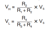 如果VIN低于VL,A2的输出高,电流流过D2,VOUT低。同样地,如果VIN升高到VH以上,A1的输出很高,电流流过D1,VOUT低。窗口比较器阈值电压设置如下: