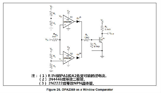 图26显示了用作窗口比较器的OPA2369。阈值由VH和VL设置,VH>VL。当VIN<VH时,A1输出低。当VIN>VL时,A2的输出为低。所以,只要VIN在VH和VL之间,两个运算放大器的输出都是0V。这种结构的结果是没有电流流过任何一个二极管,Q1切断,基极电压为0V,并且VOUT强制高。