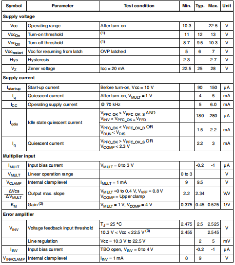 上述OVP功能处理“正常”过电压条件,即由于负载/线路突然变化或在启动时发生。如果过电压由反馈断开产生,例如当输出的上电阻分压器(R1)无法断开,引脚PFC U OK后面的附加电路检测到电压相对于pin INV的间隙。如果电压间隙大于40 mV且OVP激活,触发FFP,门驱动活动立即停止,设备关闭,它的静态消耗降低到180μA以下,并且只要IC的电源电压高于UVLO阈值。同时别针脉宽调制锁存被断言为高电平。脉宽调制锁存器是一种能够提供2.8伏电压的开源输出最小负载为0.25 mA,用于跳闸PWM的闭锁关闭功能控制器集成在级联式dc-dc变换器中,使整个单元处于闭锁状态。重新启动系统有必要回收输入电源,使Vcc的电压L6563S低于6V,其中一个PWM控制器低于其UVLO阈值。引脚PFC_OK将其作为非锁存IC禁用的功能加倍:低于0.23V的电压将关闭IC,将其消耗降低到2毫安以下。在这种情况下,PWM_停止和PWM锁存器保持高阻抗状态。要重新启动集成电路,只需让电压针脚高于0.27 V。请注意,这些功能不仅提供反馈回路故障的完整保护或者设置错误,也可以防止自身的保护失效。的任一电阻器PFC U OK分配器故障短路或断开或PFC_OK引脚浮动将导致关闭IC和停止预调节器。